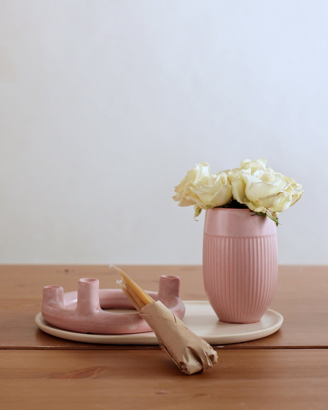 The bundle includes a three-candle candle holder, a pack of 10 candles, an Ella glass that doubles as a small glass and vase, and an Ella plate