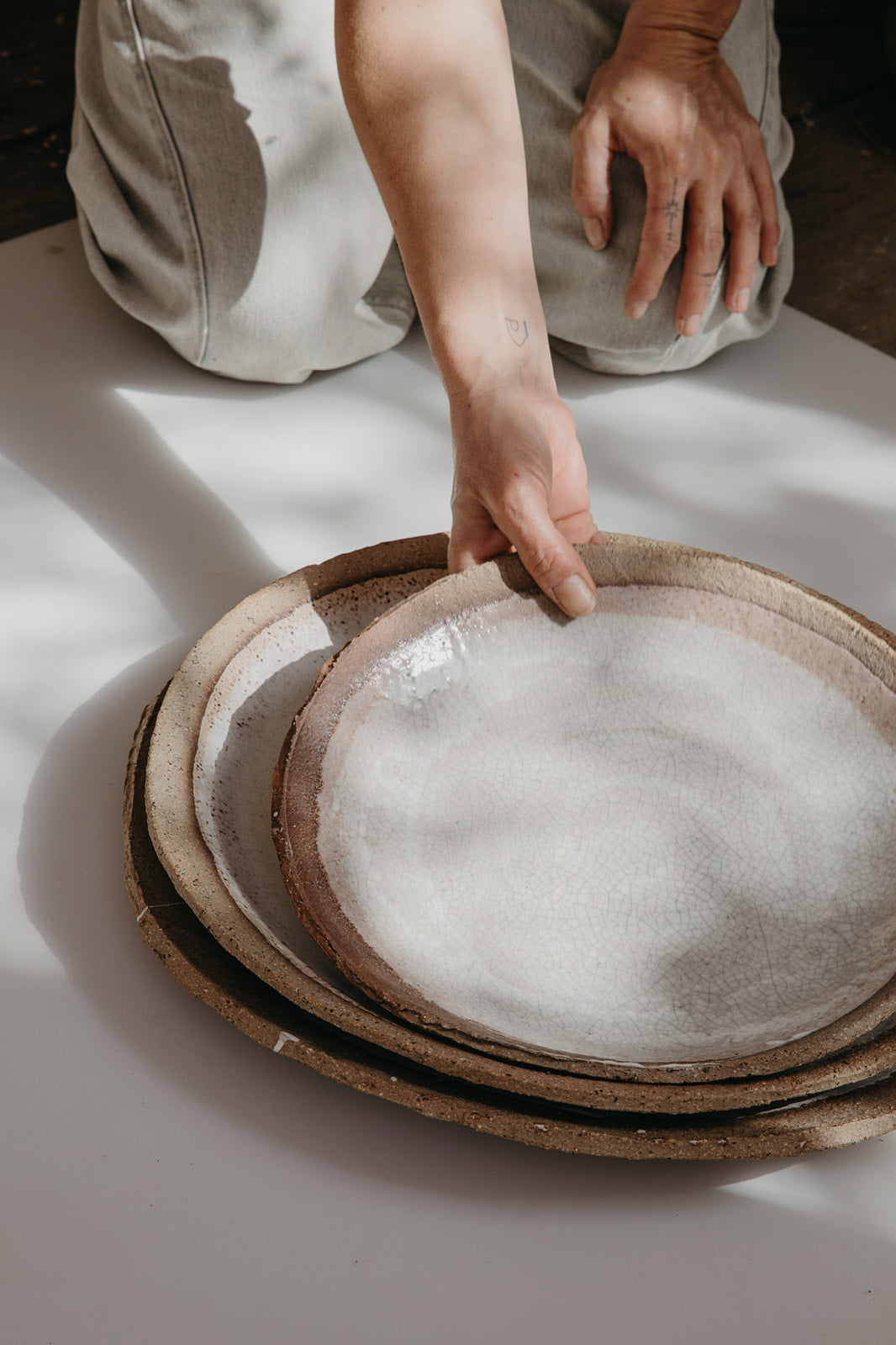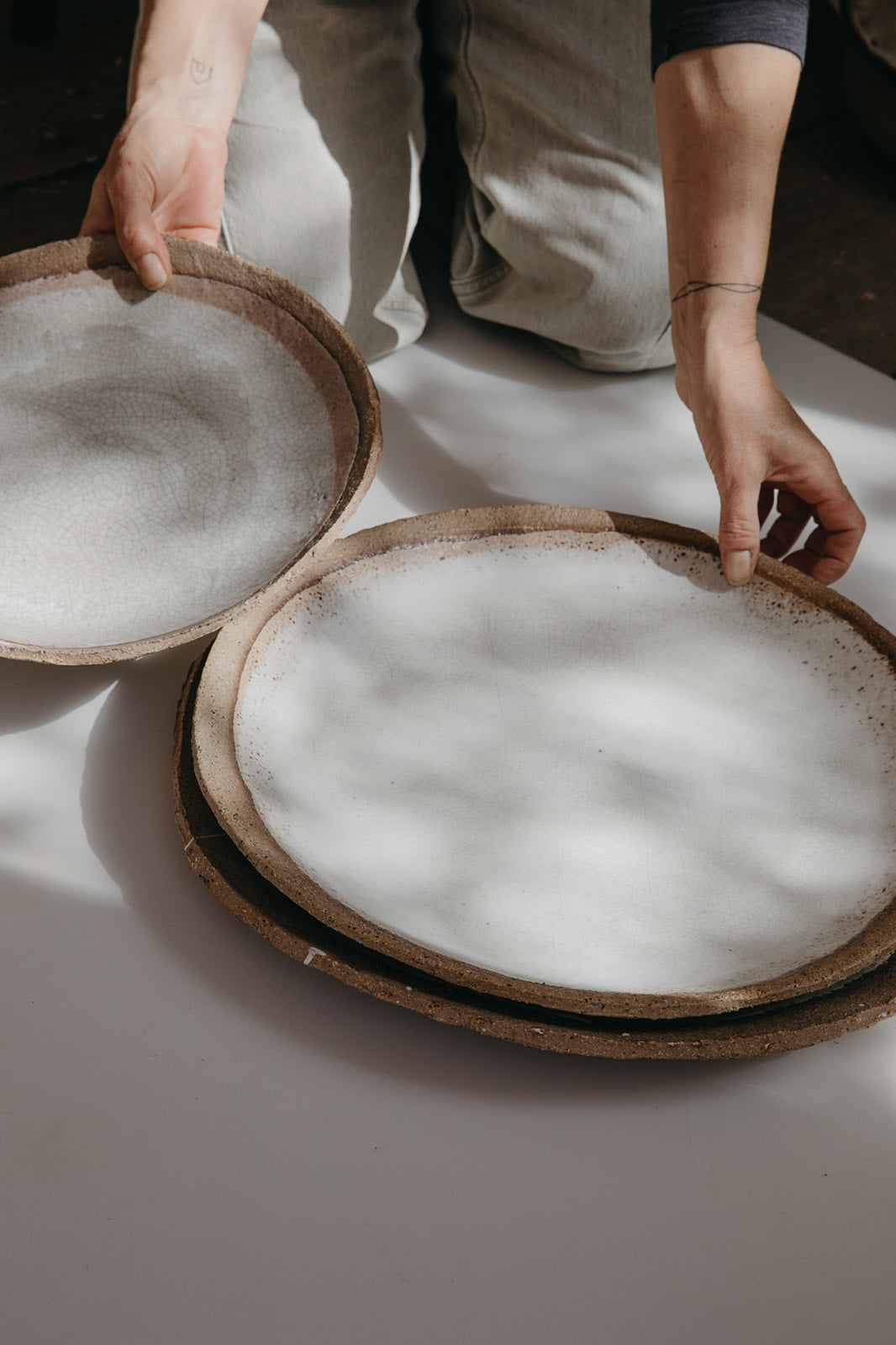 Handmade ceramic serving plates with a wide, gently curved surface.