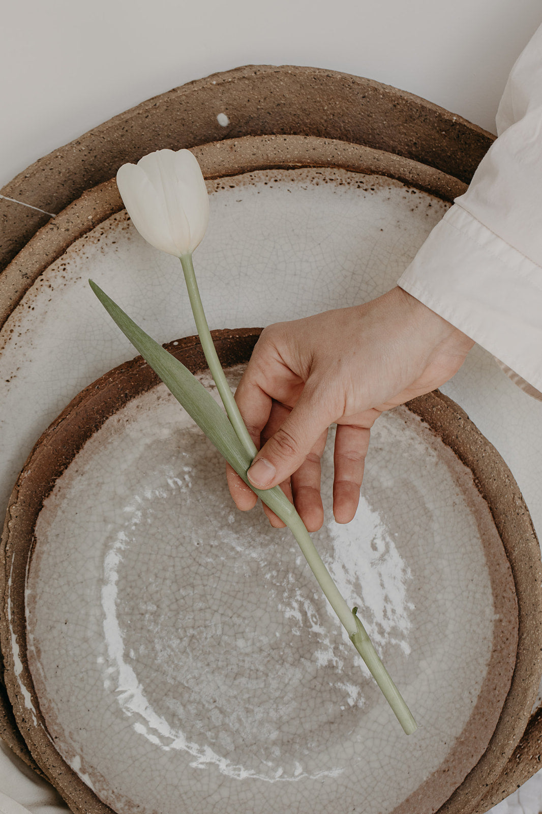 Crafted from speckled wild clay and finished with a porcelain slip glaze on the interior, the crackled white surface reveals a soft crescent of exposed clay along the edge. The contrast between the raw clay and the smooth interior glaze gives each plate a distinct material presence.