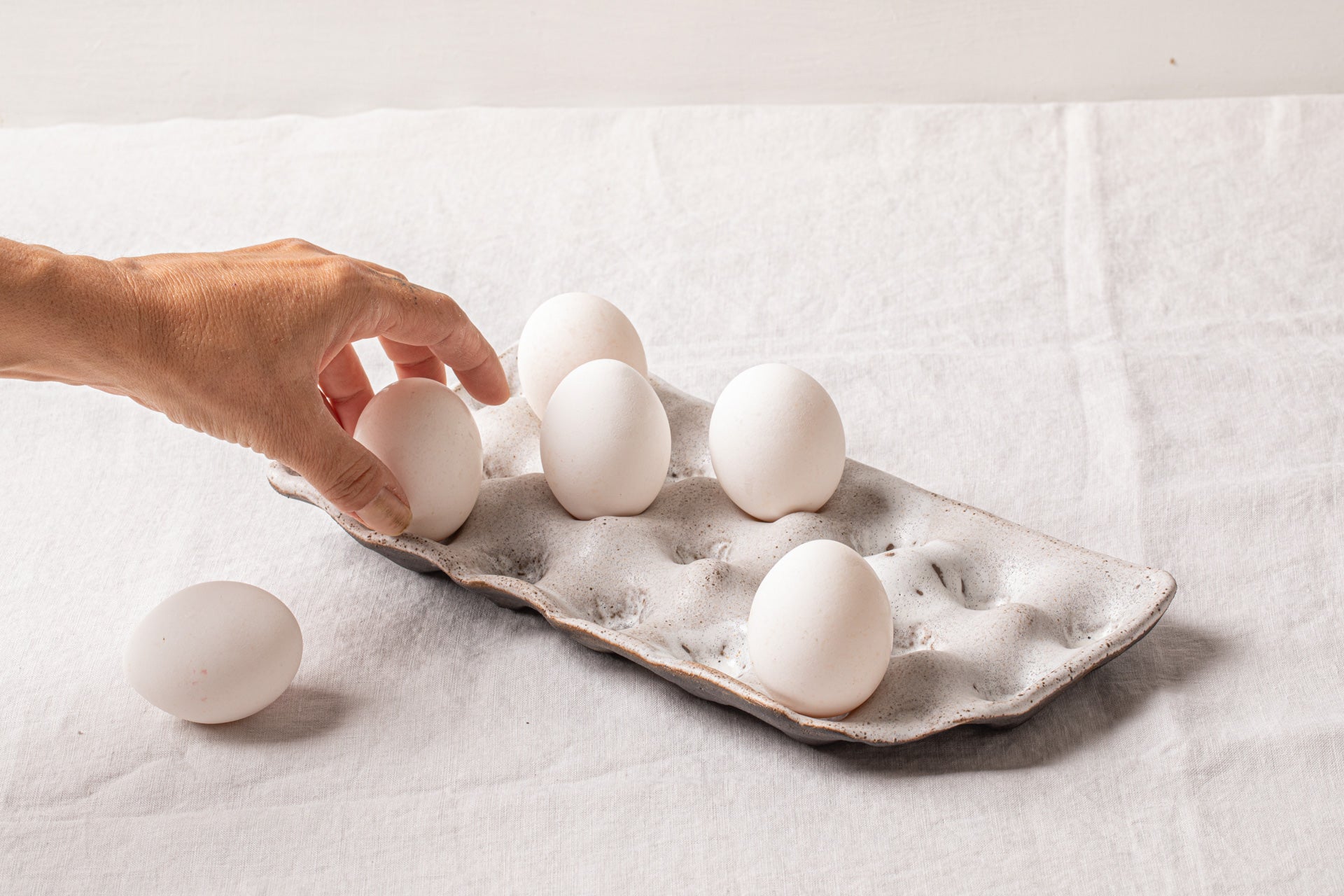 A handmade ceramic tray designed for serving eggs at the holiday table, Shabbat dinners, and festive gatherings. Its playful, sculptural design brings character to the table while keeping the presentation clean and intentional.